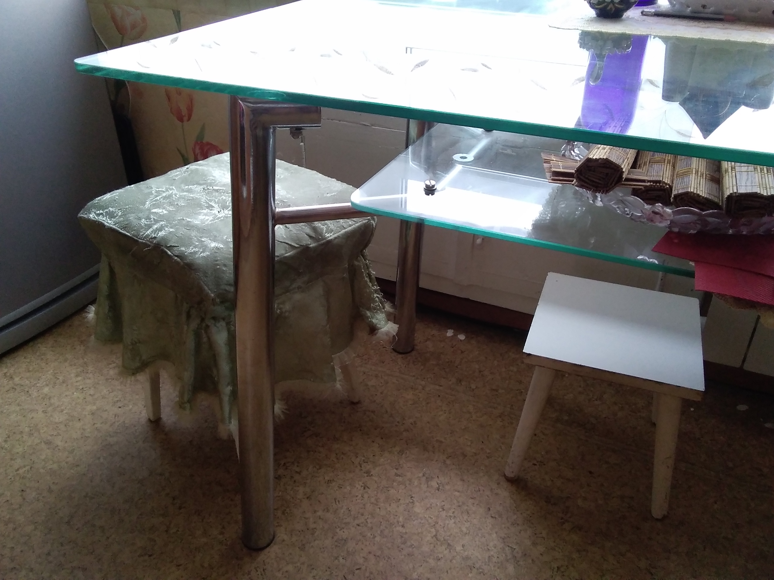 Нажмите для просмотра прикрепленного файла осталось верхнее стекло и ножки, нижнее лопнуло, но размеры есть. Верхнее стекло клеится к пятакам ножек, нижнее на болтах или тоже можно приклеить на пятаки. Отдам в умелые руки.