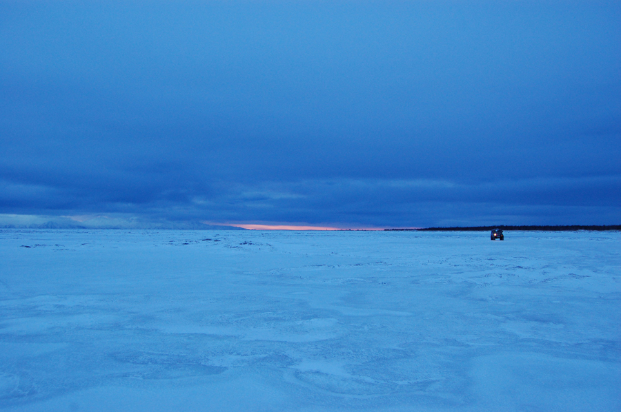 Уже в полной темноте выскочили обратно на тот вредный пригорок. Там я впервые увидел как летают Эскудики. Повесились там с лопатами и веревками ещё полчаса... выехали на лед... и обалдели. Зарево заката, кромешная тьма кругом и фары. Красота неописуемая... так сразу стало ... в общем мы ещё не знали, ЧТО нас ждет перед Олой. Когда выскочил на берег, забыл совсем о том, что еду на заднем приводе, так что первая яма - и я в заднице...