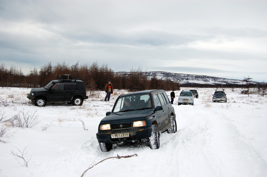 Эскудики идут в стандарте. Порой застревают по очереди в одной и той же яме, однако ребята весьма активно спасают друг друга, быстро и продуктивно работают лопатами, веревки туда-сюда. В общем едем. На полях повеселились. Снег разной глубины, дорога иной раз представляет весьма глубокую колею, часто приходится искать объезды.