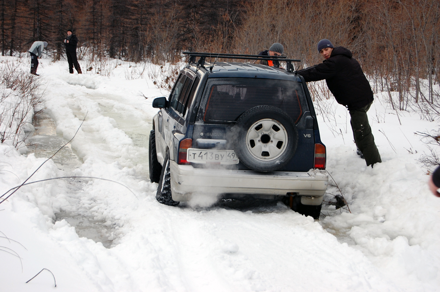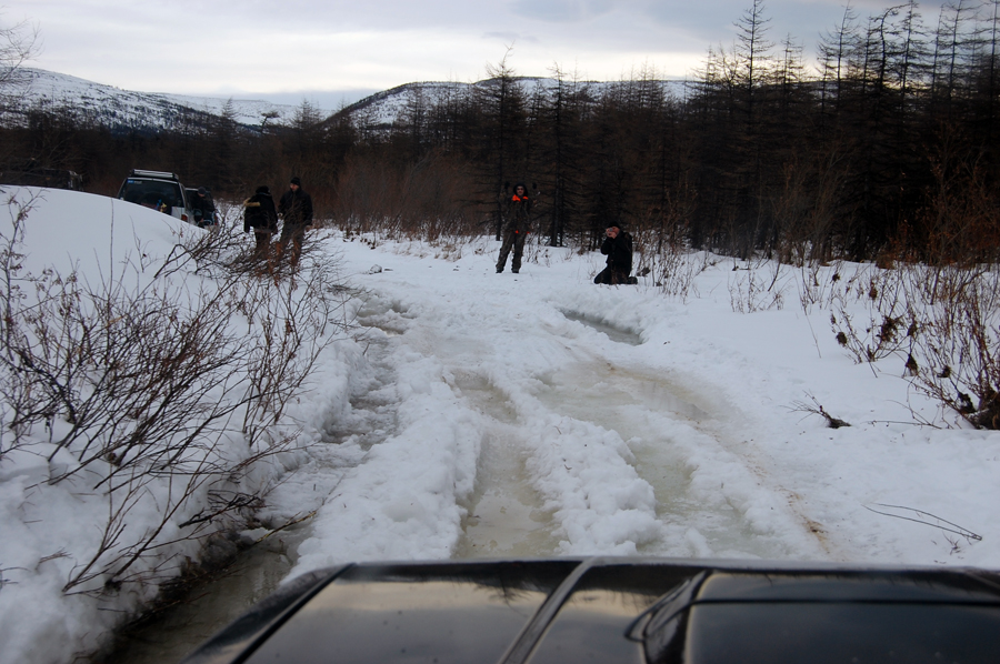 Первое веселье началось сразу за Олой, где засел Кантер, который шел впереди нас. После того, как он вызволил себя с помощью лебедки, в этом же месте засел и я. Вытолкали меня и поехали дальше... однако прорваться сразу смогли далеко не все. Пришлось последнему возвращаться. В итоге мы с Андреем и Таней (на УАЗе) ушли и вперед и скоро оказались на льду Лимана. Там прождали достаточно долго. Андрей с Таней не выдержали и рванули вперед. В это время позвонил Павел и поведал нам о том, как попасть в распадок и что "не суйтесь налево, едьте прямо". Где и как там сворачивать я так и не понял. Ладно, на месте разберемся. В итоге ожидание коротали катанием на санках по льду.