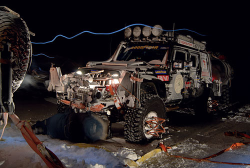 там была такая ситуация... Тем, кто ехал в это путешествие, давали деньги спонсоры, и деньги были ограничены. в том плане, что стояла цель проехать маршрут на биотопливе, и прочая херня. Те, кто давал деньги, интересовался самим фактом прохождения маршрута. И никого из них особо не волновали подробности. были жёсткие рамки. Это с одно стороны, а с другой, руководитель экспедиции думал именно о бюджете, а не о экспедиции. поэтому они и ехали два сезона до Уэлена. С другой стороны, не могу ими не восхититься, второй зимой они прошли на колёсной технике по маршруту, где и пьяные вездиходчики не ходят... ( необходимости нет). На фотках стоят приблуды, помогающие поставить запаски, в спарку к основным колёсам. А хитрые конструкции по бокам предназначены для установки понтонов, для преодоления Берингова пролива.
