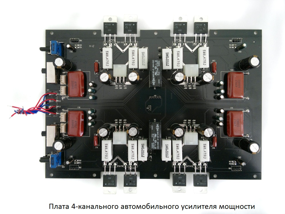 4. Качественные компоненты - транзисторные сборки в дифкаскадах, чип-монтаж основных схем(хороший тепловой баланс схемы, минимальные наводки, хорошая виброустойчивость и т.д.), применение LowESR электролитических и пленочных конденсаторов(работают в широком диапазоне частот, быстро отдают заряд, т.е. могут обеспечить большие пиковые токи в нагрузку и качественную фильтрацию питания), двухсторонние печатные платы с экранирующим подслоем(обратите внимание - основная схема находится в зазоре между металлическим корпусом и металлизацией платы - почти коробочка), выходные МОП-транзисторы делали нам под заказ с большой площадью кристалла(очень хороший тепловой контакт и инерция), проводной монтаж витыми парами всех силовых линий - минимум наводок на слаботочные схемы.