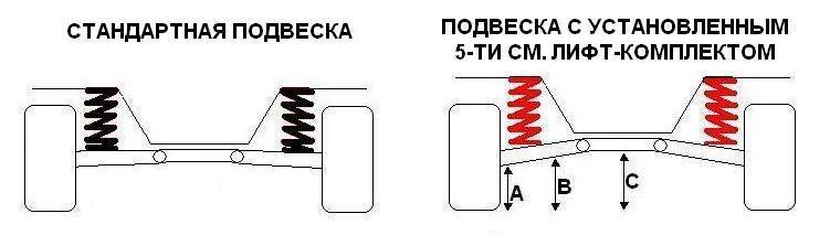 Лифт подвески широко распространен, относительно доступен и прост в установке. Лифт комплекты, как правило, состоят из из 4-х более длинных пружин и 4-х амортизаторов с увеличенным, относительно штатного ходом. Практически все лифт - комплекты заявляются продавцами, как увеличивающие клиренс на машине на 5 см.