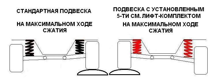 Кроме того, лифт не является постоянным в движении. Принципиально важным для понимания моментом является то, что после лифта подвески сохраняется прежнее верхнее возможное положение колеса. Это означает, что при сильной раскачке автомобиля, при движении загруженной машины по неровной дороге, при наезде на препятствие и т.д., пружина из лифт-комплекта, может сжиматься практически до той же длины, что и штатная, рычаги подвески упираются при этом в отбойники, а колесо фактически принимает верхнее положение в арке, в точности соответствующее положению колеса на машине без лифта подвески и с обычной пружиной.