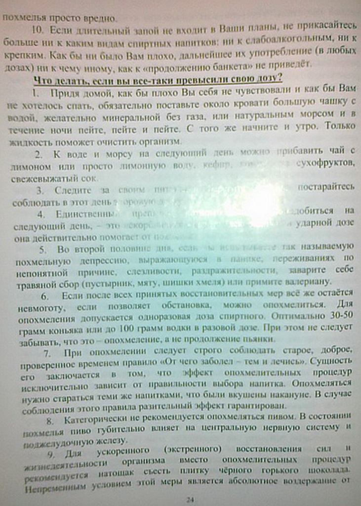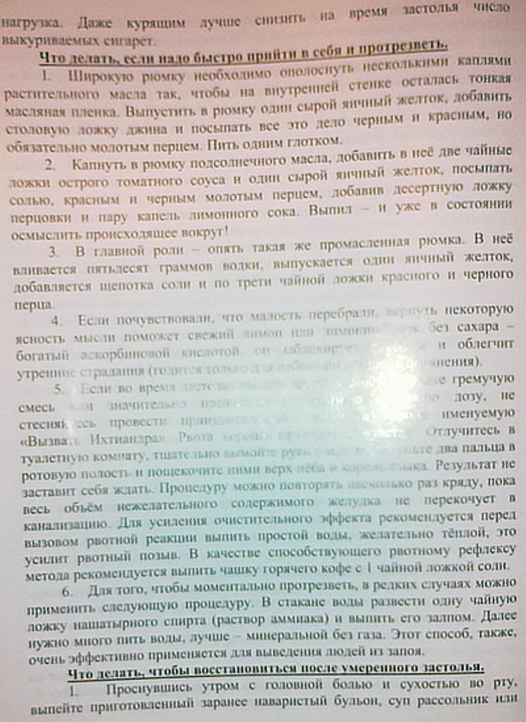 «При опохмелении следует строго соблюдать старое, доброе, проверенное временем правило «От чего заболел – тем и лечись». Сущность его заключается в том, что эффект опохмелительных процедур исключительно зависит от правильности выбора напитка. Опохмеляться нужно стараться теми же напитками, которые были вкушены накануне. В случае соблюдения этого правила разительный эффект гарантирован», – пишет автор в главе «Что делать, если вы все-таки превысили свою дозу?».