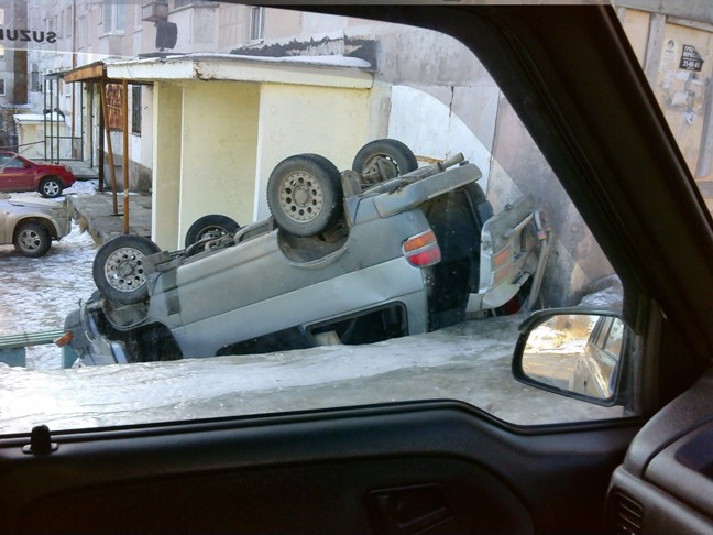 На 31-м Сафарь (Патрол?) стоит носом к полиметаллу в снежном бруствере, Дэлика-дельфин пропахала газон метров на 5-6 по курсу к Полиметаллу, а две маленьких машинки стоят чуть ближе к кольцу, но их я уже не разглядывал, надо было проезжать. По крайней мере на эти пузотёры Дэлика точно не падала, поэтому я не знаю, что там говорят. Место действия - примыкание Транспортной к Кольцу, траектория Дэлики - "с кольца к ПМ".
