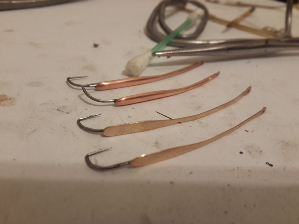 Если делать напайки типа "кобр" то для этого лучше использовать фольгу из нужного металла, которую надо напаять на иглу. А если делать блесну как на фото то надо обтачивать - это долгий процесс, я это делаю при помощи инструмента Dremel. Кобры быстро делаются, вырезал ножницами, припаял, полирнул и все. Для фиксации лучше использовать хирургический зажим для сосудов - он фиксируется хорошо. Вообще профи делают эти дела гораздо быстрее, у меня все это долго происходит потому что отвык.