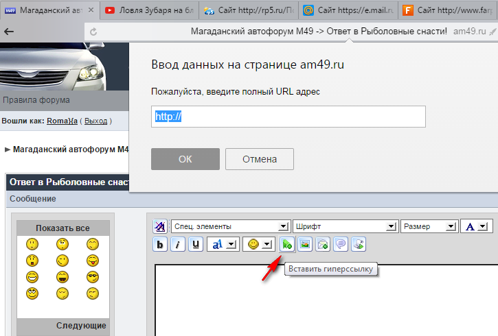 Нажмите для просмотра прикрепленного файлаЕсть еще один, в поле ввода сообщения есть кнопочка, рядом со смайлами - "вставить гиперссылку". Тоже самое, копируешь - вставляешь.