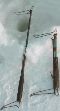 При переходах с лунки на лунку леска и ставка наматываются на «крюки». Теперь можно взять удочку в одну руку, бур в другую и бежать за уходящим косяком.