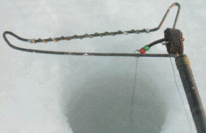 Удочка переносится в отдельном прямоугольном чехле, сшитом из кожзаменителя гладкой стороной внутрь, чтобы не цеплялись крючки «самодура». Я беру с собой на лед две или три такие удочки, хотя ловлю только на одну. Если рыба ходит на разных глубинах, можно использовать «поисковую» ставку с дюжиной крючков, закрепленных на расстоянии до 30 см один от другого. Если потребуют условия ловли, общую длину ставки можно увеличить еще больше; в удочке при этом ничего менять не нужно. «Крюки» и мотовильца сделаны из стальной оцинкованной проволоки диаметром около 2 мм. Чтобы петли намотанной лески не двигались по «крюкам», на их внешней стороне намотаны редкие спирали из латунной проволоки, которая должна быть припаяна к «крюку» в нескольких точках. Под верхним «крюком» закреплен обрезок микропористой резины, через которую пропущена пружина кивка. Кивок должен быть весьма жестким - ведь вес грузила для подледной ловли в море составляет 30-40 г. На конце кивка припаяно небольшое колечко из нержавеющей проволоки; второе такое же колечко закреплено на удилище у самого основания кивка. Через эти колечки пропущена леска. Проводить ее через пружину кивка не следует: при изменении длины лески вода попадает внутрь кивка и замерзает.