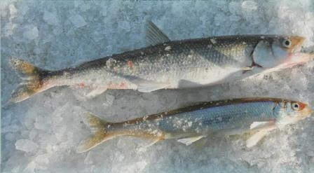 Кроме наваги и корюшки, мне приходилось ловить со льда и других морских рыб, при этом нужно заменять только ставку «самодура». Если появляется малоротая корюшка, нужно применять мелкие крючки (около №3,5 по отечественной нумерации) с кусочками зеленого силикона от мягкой спиннинговой приманки. Сельдь, которая подходит к берегам в мае, берет и на корюшковые самодуры, но часто обрывает поводки. Для этой сильной рыбы лучше применять более грубую оснастку с крючками №5 или 6 на поводках 0,2 мм.