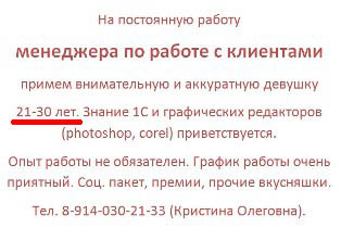 Иными словами, если директор ООО «Три брата и лопата» хочет найти секретаршу — «девушку с презентабельной внешностью строго до 25 лет», он не имеет права включать подобные требования в свою вакансию, если, конечно, не хочет заплатить штраф.