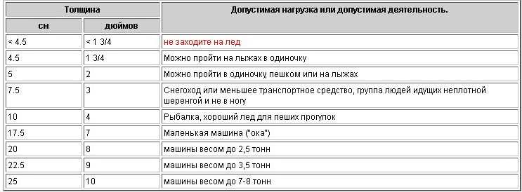 Информация в таблице носит ориентировочный характер, поэтому - держитесь подальше ото льда, если есть сомнения!