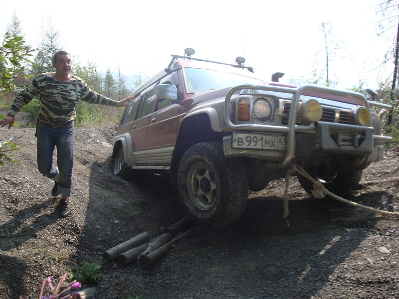 жара и пыль становились только хуже. На Бурхалинскомперевале Турбосафарь закипел, жара стояла за 30. Остановились около сворота на Мяунджу, от Магадана отошлина 700 км, федералка уходит прямо, а намсворачивать налево от цивилизации на Старую дорогу, вдали белел многоэтажкамиброшенный Кадыкчан. Перекусили тушенкой и двинули дальше, было уже около 9часов, а ночевать по плану должны встать у метеостанции Эмтегей, до которойбыло еще больше 30 км по Старой трассе.