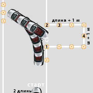 В ходе выполнения упражнения экзаменатор контролирует зоны «габаритного коридора», остановки перед линией «СТОП», а его помощник – зоны «габаритного коридора», старта.