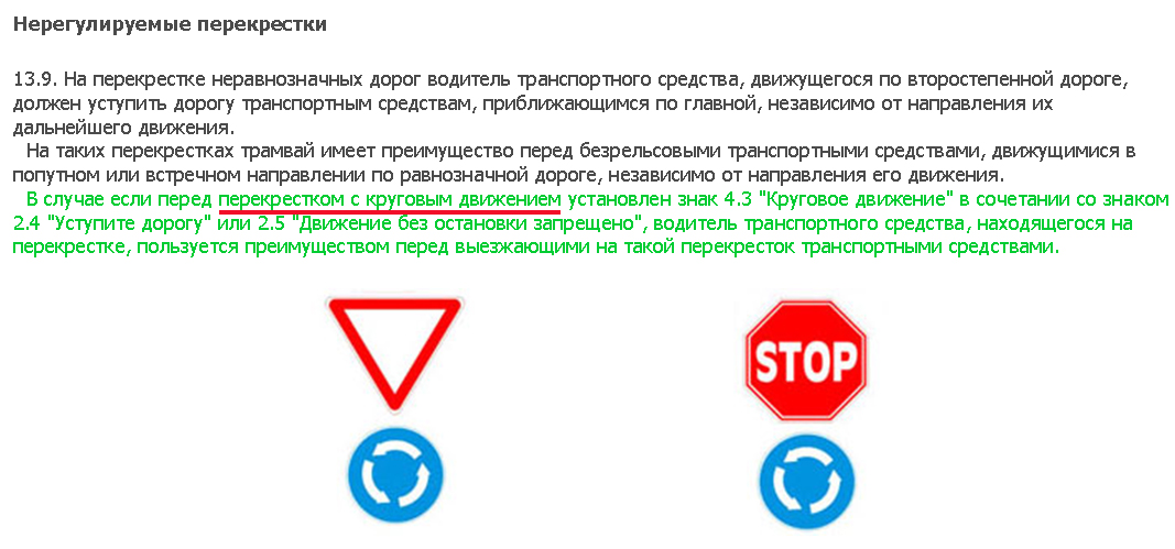 Напомню, что в настоящее время существуют только перекрестки с круговым движением обозначенные знаком 4.3 "Круговое движение", но после 20 ноября 2010 года могут появиться перекрестки обозначенные одновременно знаком 4.3 и знаком 2.4 "Уступите дорогу".