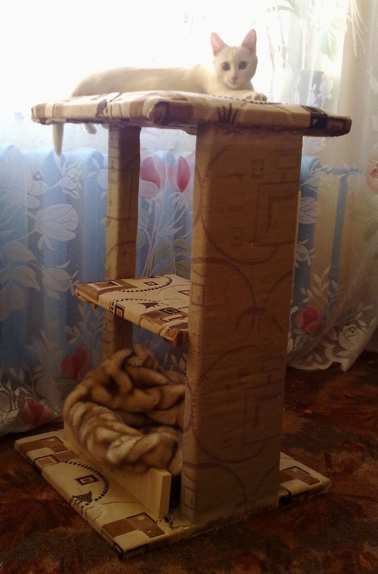 Mango1890, Для когтеточки использовал мебельную доску (магазин ЦУМ) и плюш диванный (магазин Ткани на Болдырева), для мягкости полок и нижней лежанки подошел старый пуховик жены.