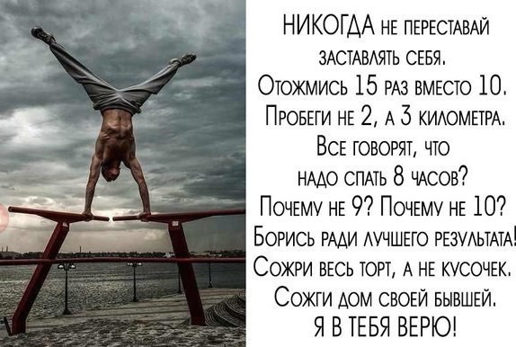 А нагрузки можно легко регулировать, на лыжне никто не заставляет ставить рекорды. Я только на 31-м году своей жизни осознал, что человеку возможно очень многое, если только он мотивирован. Хотя, конечно, свою поправку тут вносит природа, т.е. генетика. К примеру, товарищ, который изначально вытаскивал меня ходить на лыжах, говорил, что есть физическое удовольствие от нагрузки. У меня его нет. Никто не верит, но - нет. Это как у кого-то волосы светлые, а у кого-то тёмные, ничего не поделать с этим. Я лыжи или другой спорт воспринимаю не как средство получить приятную физическую усталость, а как средство полностью отключиться от проблем, сменить обстановку, залезть на горки какие-нибудь, и сохранить форму, не хочется расплываться в тюленя, не для других, а для себя. И вот вытаскивали меня, было тяжело, потом пару лет вообще не ходил, а прошлый год взял себя в руки, просто приехал, походил час, ну через день офигел от боли в ногах, на следующих выходных походил полтора часа, на следующих два... Вопрос тренировки. Заставив себя сегодня сделать 10 отжиманий, завтра 10, через неделю 11, через ещё неделю 12, к концу года их можно сделать 100.