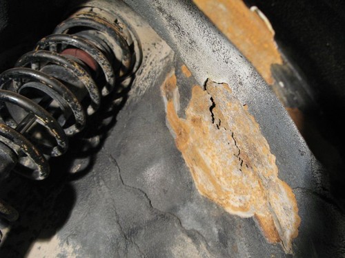 Удар в заднюю подвеску был сбоку слева. Такой, что деформировался подрамник и поломался нижний рычаг. Рычаг кто-то сварил и так и ездил.