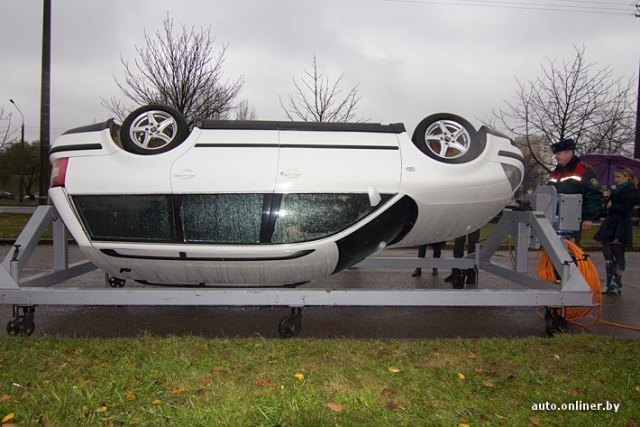 Сегодня днем Минская ГАИ провела необычную акцию. Сотрудники Госавтоинспекции предлагали автолюбителям испытать, каково это — оказаться в переворачивающемся автомобиле. Обязательными условиями участия были хорошее здоровье и пристегнутый ремень безопасности. Тренажер на базе Volkswagen Passat B5 предоставили в МЧС. Таким образом инспекторы хотели показать минчанам, с одной стороны, что чувствует человек, попавший в ДТП с переворачиванием, а с другой — насколько важно всегда пристегиваться.