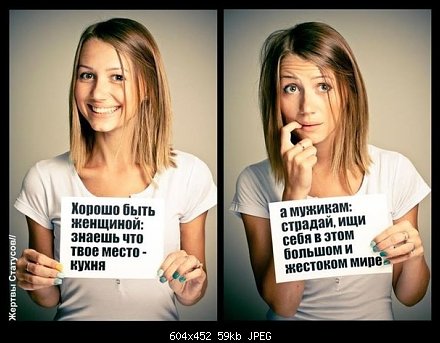 Всё это конечно красиво читать, когда наши постоянные форумские популисты, срывают бурю оваций в виде Спасибо, кидая лозунги, типа свободу женщинам, хотят служить пусть служат, не хотят пусть не служат. Но меня терзают смутные сомнения что в их семьях точно такая же демократия и полная свобода с женщинами. Типа хотят пусть приходят домой ночевать, не хотят пусть не приходят, а ночуют где хотят и с кем хотят.
