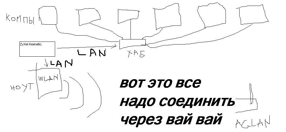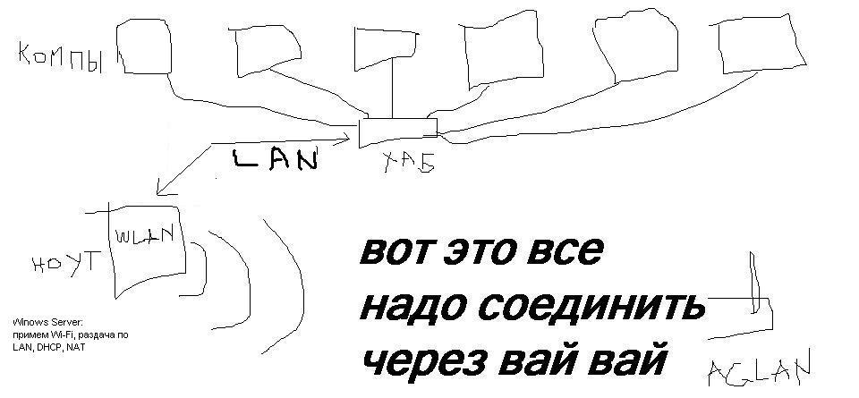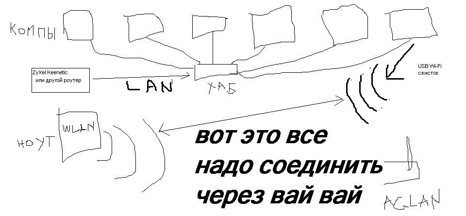 Нажмите для просмотра прикрепленного файлаРоутер в режиме беспроводного моста, ловит вай-вай и раздает его по проводу, один из компуков через USB вай-вай свисток раздает сеть на бук и другие беспроводные клиенты.