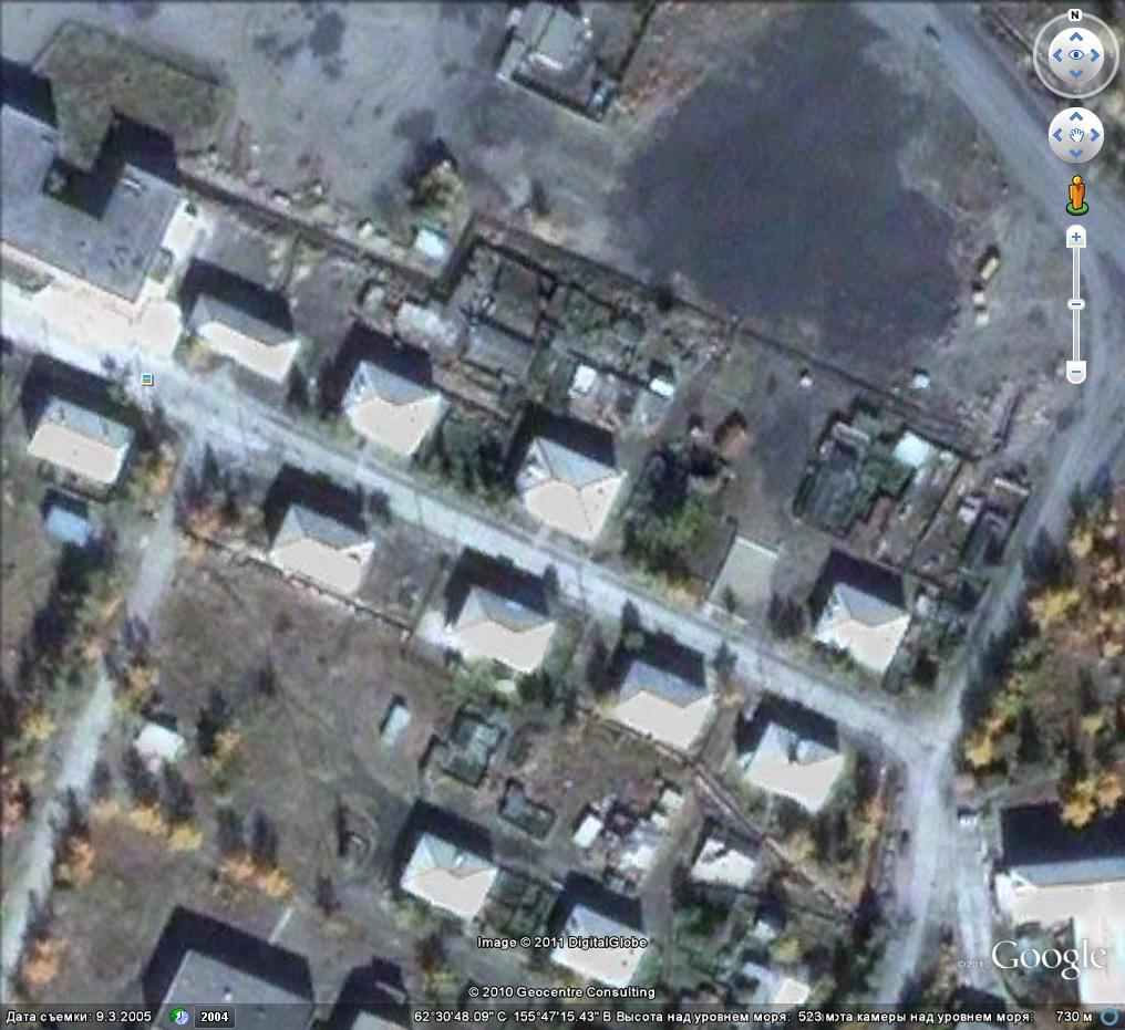 Вот например Омсукчан, ул. Ленина, сбербанк в углу возле дороги если я не ошибаюсь, на крыше стоит параболическая антенна С 62°30'46,26", В 155°47'18,87":