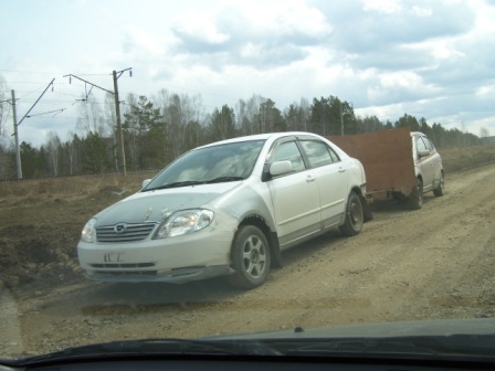 Нажмите для просмотра прикрепленного файла И дальше - вот она! Ж...Попа! Именно здесь обрывают обвесы, брызговики, пробивают колеса и картеры. Именно здесь встревают всерьез и надолго дальнобои, когда раскисает дорога. Именно здесь у грузовика, который перевез наши вещи в Иркутск, на обратном пути сломалась шаровая и они простояли в ремонте два дня. Сами преодолевали участок Нижний Ингаш -Тины два часа. 50 КМ! Нормальная дорога без грунтовых разрывов началась в районе Тулуна.