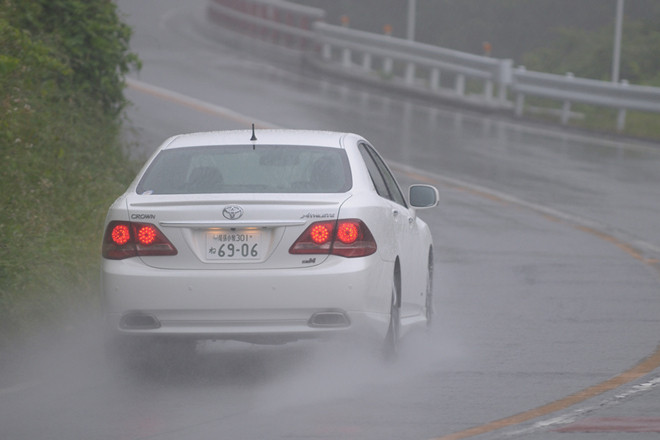 Испытательная поездка, так уж получилось, пришлась на дождливый день. А что значит мокрый асфальт, когда приходится испытывать высокоскоростную машину на дороге общего пользования? Да то и значит, что полное представление о характере этой машины составить не удастся, поскольку, сами понимаете, погонять во всю мощь уже не получится. Нет, вдавить педаль газа в пол тебе никто не помешает, но толку-то от того! Ведь чуть что с колесами не так (а на сырой дороге это «не так» случается сплошь и рядом), как тут же вмешивается система слежения за силой сцепления колес с дорогой (traction control), и все, автомобиль будет, образно говоря, слушать тебя, а делать все по-своему. А раз так, тогда как почувствовать разницу между базовым Crown Athlete и его усовершенствованной версией +М Super Charger? Ведь резко менять темп движения, ускоряться в окружении других участников движения — все это умеет делать и обычный Athlete, которому вполне для этого хватает его 315 «лошадок» и 38,4 кг-м крутящего момента. А тут — на 45 «лошадей» больше, а как воспользоваться этой разницей, если чуть что, а «электроника» тут как тут?