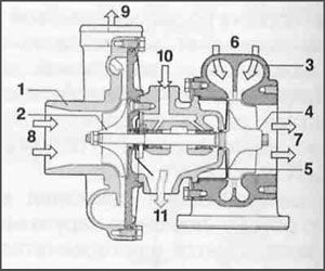 Турбокомпрессоры состоят из турбины и колеса центробежного нагнетателя (компрессора), установленных на общем валу. Для вращения турбины используется энергия отработавших газов, воздействующих на ее лопатки. Вращение турбины приводит в действие компрессор, который, в свою очередь, засасывает окружающий воздух, сжимает его и подает в цилиндры двигателя. Частота вращения ротора турбокомпрессора не зависит от частоты вращения коленчатого вала двигателя, но она в значительной степени определяется балансом энергии, получаемой турбиной и отдаваемой компрессору.