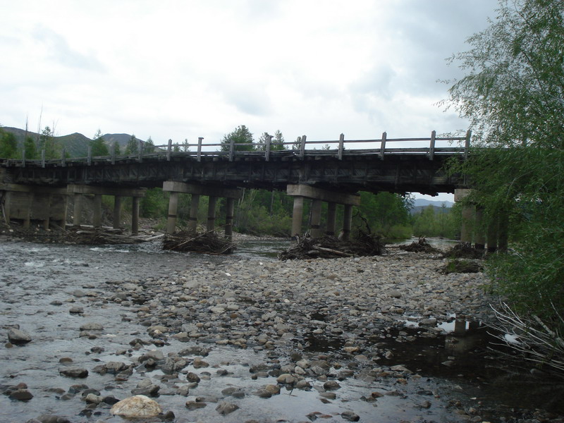 Доходим до очередной развилки, на право Мария Раскова, нам опять налево. Свернули…дальше цивилизация заканчивается, интенсивность движения по этому участку 3-4 машины в год, не больше, хотя дорога хорошая…местами. Иногда получалось разгоняться до 50 км/ч. Бетонные мосты стоят, но с обсыпанными заездами, деревянные разрушенны, так что проходить реки только в брод.