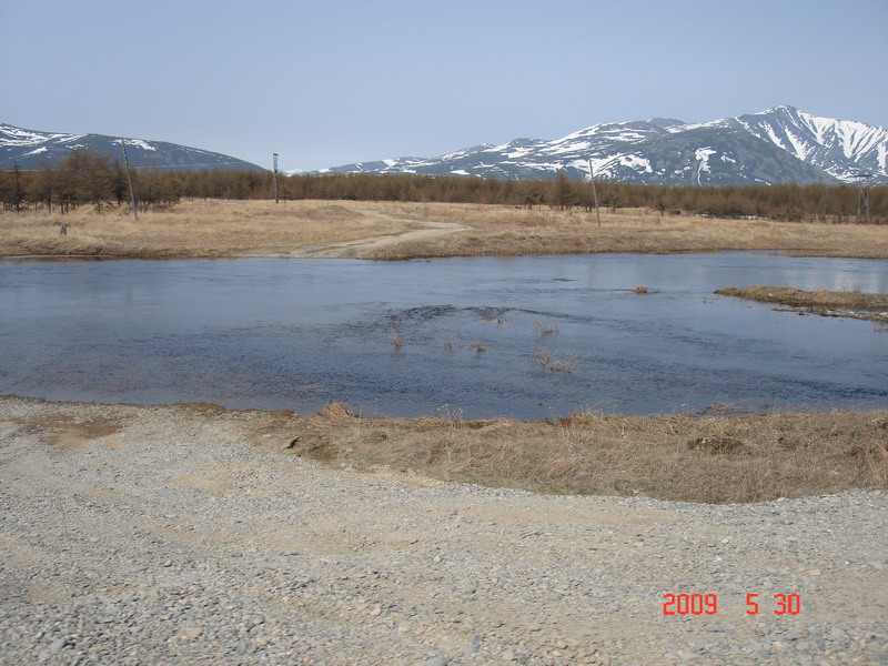 На сопке справа увидите желтые домики, там и будет между валунов речка течь через дорогу..