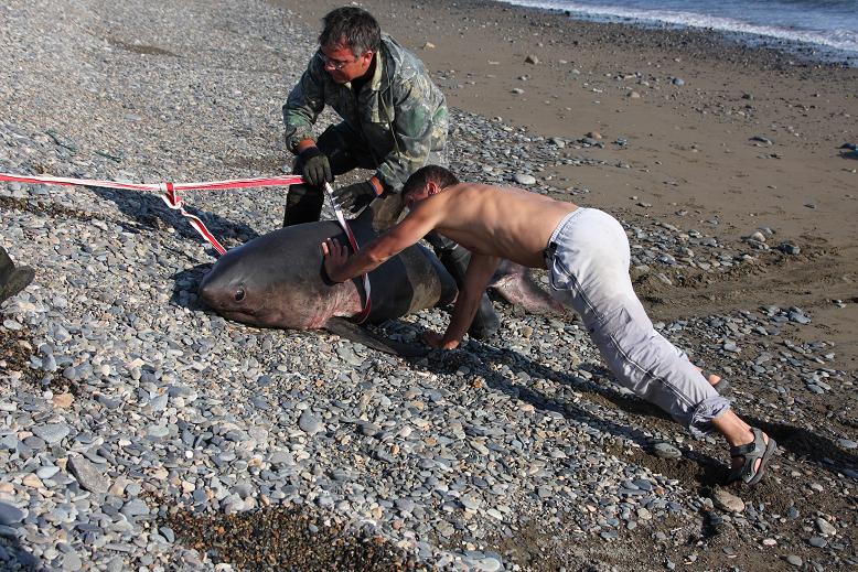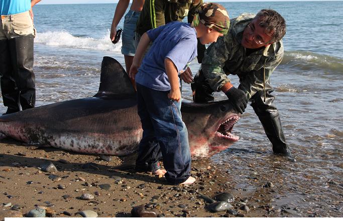 Более пятнадцати лет назад на "Соленом" компания приехала рыбачить на красную. Поставили сетку. Выпили. Один из них говорит, что то сетка затонула, наверное много рыбы попалось. Берет колотушку и на резинке поплыл доставать рыбу. Увидев в сетке хвост запутавшейся акулы так рванул на берег, что закончил грести у костра. Вобщем сетку вместе с акулой вытаскивали машиной. Оказалась сельдевая акула. А интересно, это чудовище когда вытаскивали оно было еще живое?