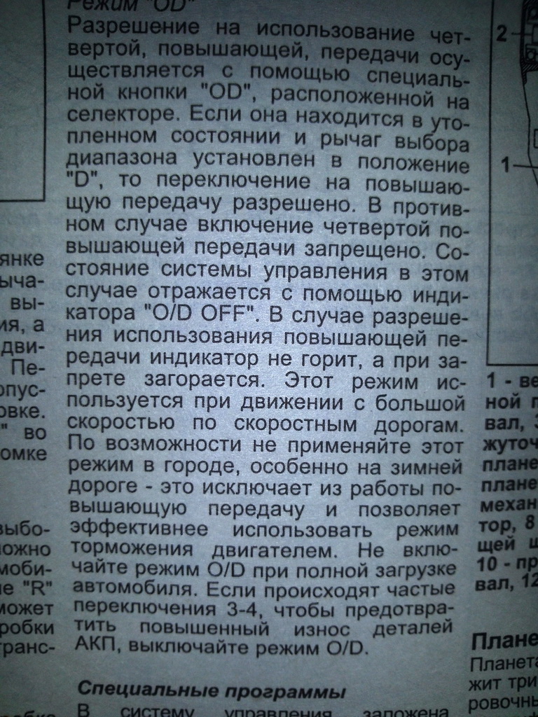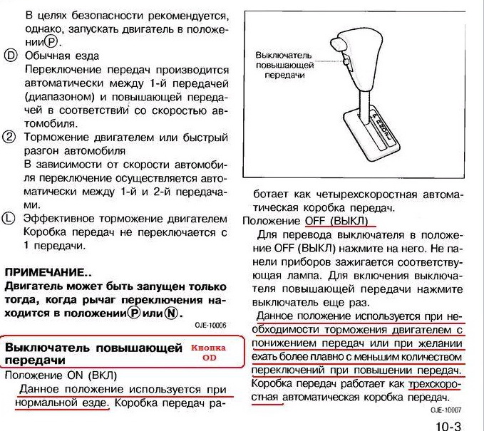 дунькович, объясню проще-кнопка ОД включает и отключает возможность включения четвертой передачи,из этого нужно исходить.в нормальных условиях эксплуатации не надо её трогать,этим занимается коробочный компьютер.по перевалам и при буксировке её надо отключать.